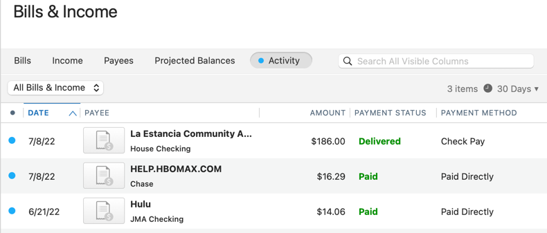 The Activity tab under Bills & Income displays any recent bills or income you sent or received. Remember to add any bills or income through your Scheduled Transactions. Otherwise, they will not be tracked under Activity. For more information, see Create new scheduled transactions.