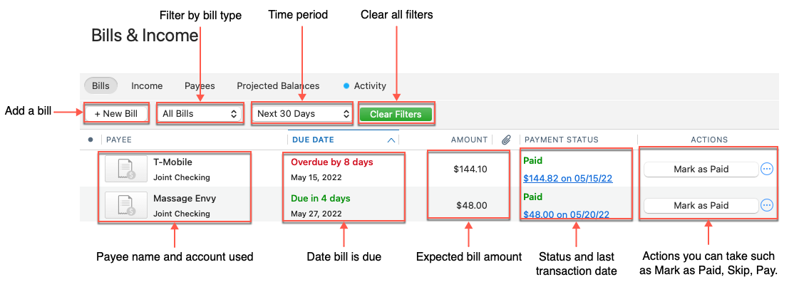 The Bills view is designed to act as a checklist for your upcoming bills and a place to review your bill activity. There are three main areas of the view: