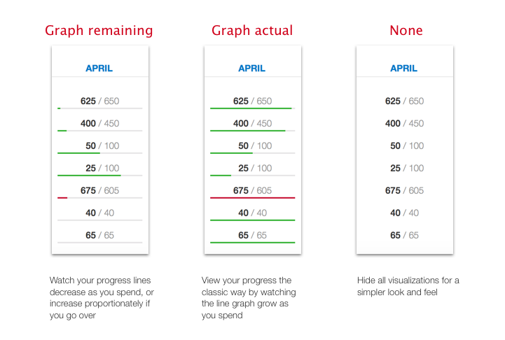 This graph style always displays the proportion you are over or under budget, and generally the more green you see the better, as these indicate categories where you have not met or exceeded your budget. The more red you see, the more over budget you are.