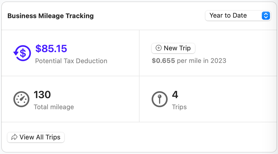 At the top, you're greeted with the title, Business Mileage Tracking. This card offers a summarized view of your mileage for easy reference.