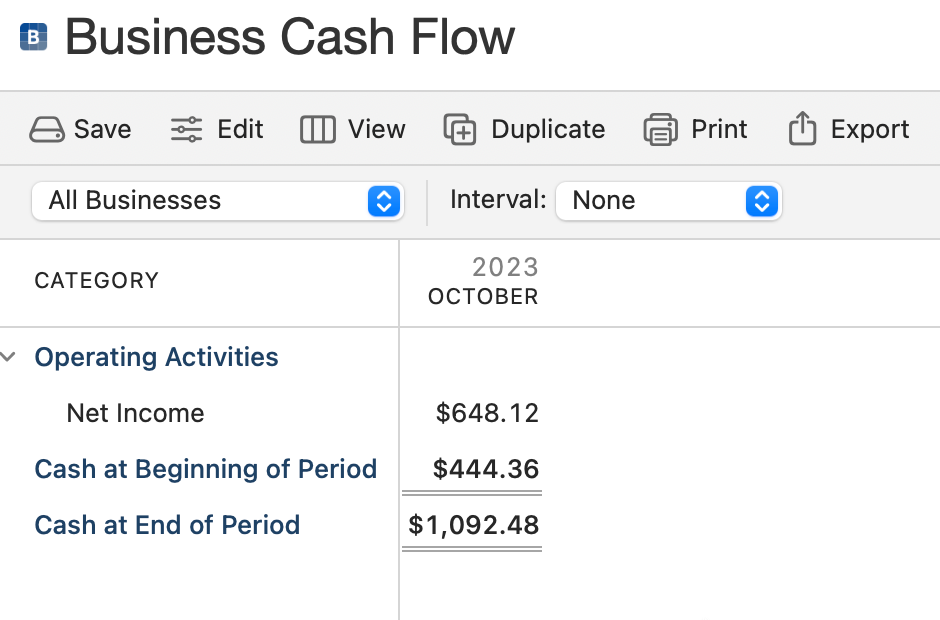 The primary sections of your Cash Flow are Operating Activities, Net Income, Cash at Beginning of Period, and Cash at End of Period. You can change the date ranges (and other details) by using the Edit button above the report.