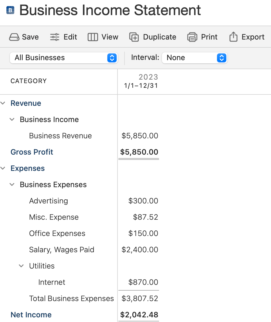 The primary sections of your Income Statement are Revenue, Expenses, and Net Income. Within those sections, your report is further divided into categories. You can change the date ranges (and other details) by using the Edit button above the report.