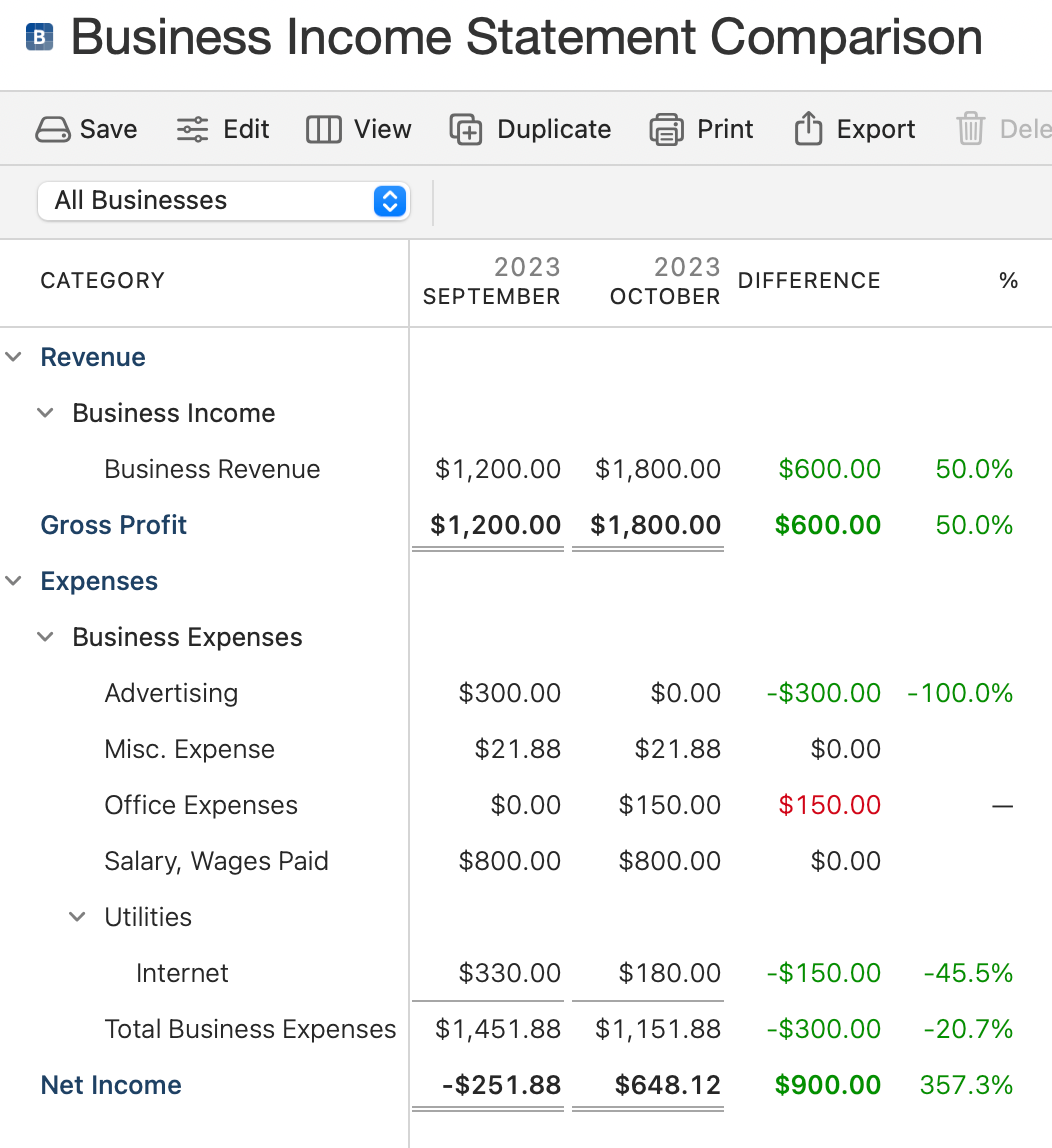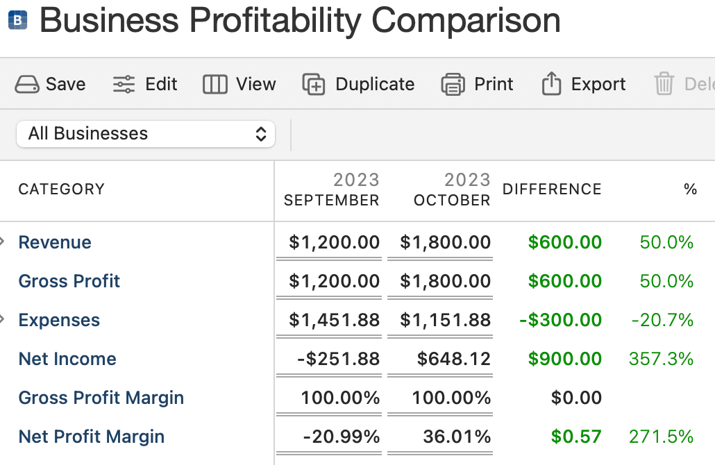The primary sections of your Business Profitability report are Revenue, Gross Profit, Expenses, Net Income, Gross Profit Margin, and Net Profit Margin. You can also expand on the Revenue and Expenses sections to see details down to the Category level. Two date ranges will be compared. You will have columns for both time periods and a column showing the difference (green for positive, red for negative). You can change the date ranges (and other details) by using the Edit button above the report.