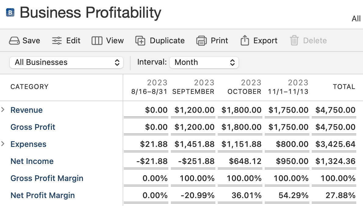 The primary sections of your Business Profitability report are Revenue, Gross Profit, Expenses, Net Income, Gross Profit Margin, and Net Profit Margin. You can break up a time period by Interval, such as Week or Month. You can also expand on the Revenue and Expenses sections to see details down to the Category level. You can change the date ranges (and other details) by using the Edit button above the report.
