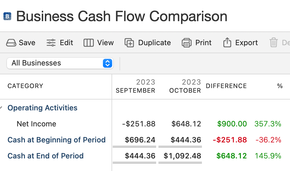 The primary sections of your Cash Flow report are Operating Activities, Net Income, Cash at Beginning of Period, and Cash at End of Period. You will also have columns for both time periods and a column showing the difference (green for positive, red for negative). You can change the date ranges (and other details) by using the Edit button above the report.