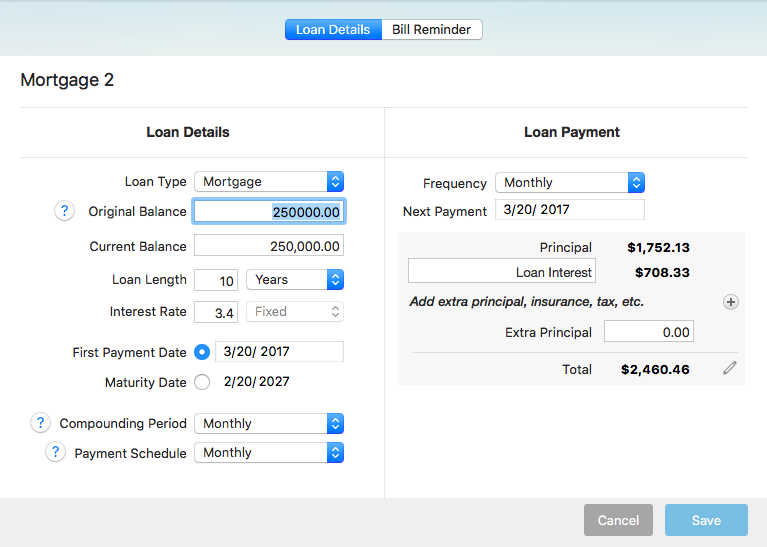 You can update your loan details by clicking on the pencil icon under the title. A sheet appears which contains two tabs where you can view details about your loan. The two tabs match the screens that you saw when you set up your loan.