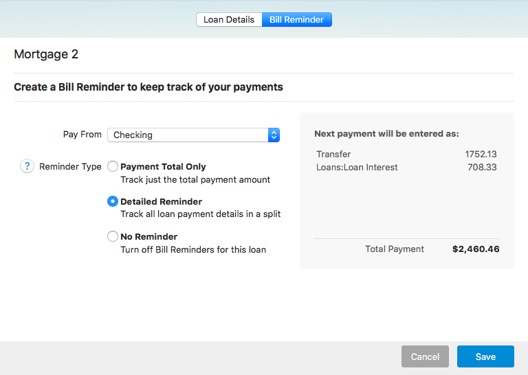 NOTE: The toolbar at the bottom that is available for other features is not displayed for the loan management feature. This feature is meant to help you track how the payments are paying down a loan. You are not supposed to need to manually update any of the payment information ā Quicken does that for you through your linked accounts. If your account is not linked, you can manage your scheduled transaction payments from the account you use to pay your loan.