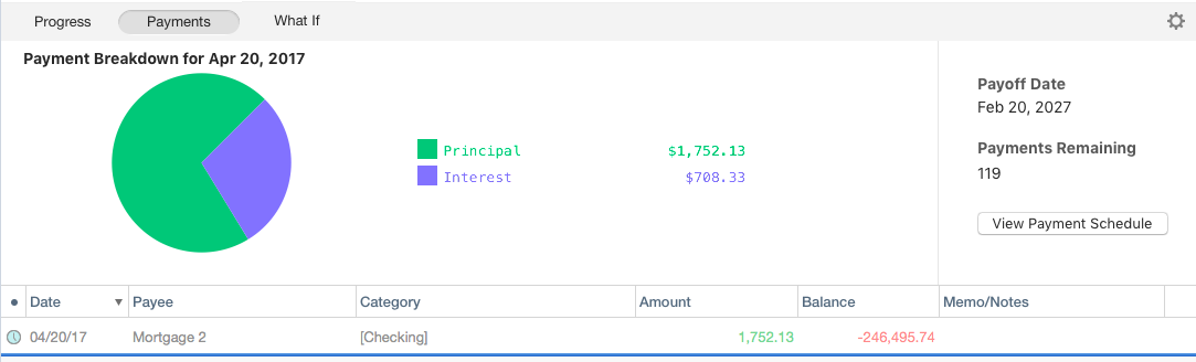 The information under the pie chart shows the balance adjustments and scheduled transactions. These act as a proxy to the payments that you make. Mark them Paid once you make the payment. A new scheduled transaction with updated principal and interest amounts are automatically generated as soon as you mark the payment Paid. If you find that you need to make changes to your payment, click the Edit Loan and Payment Terms button to make those changes.