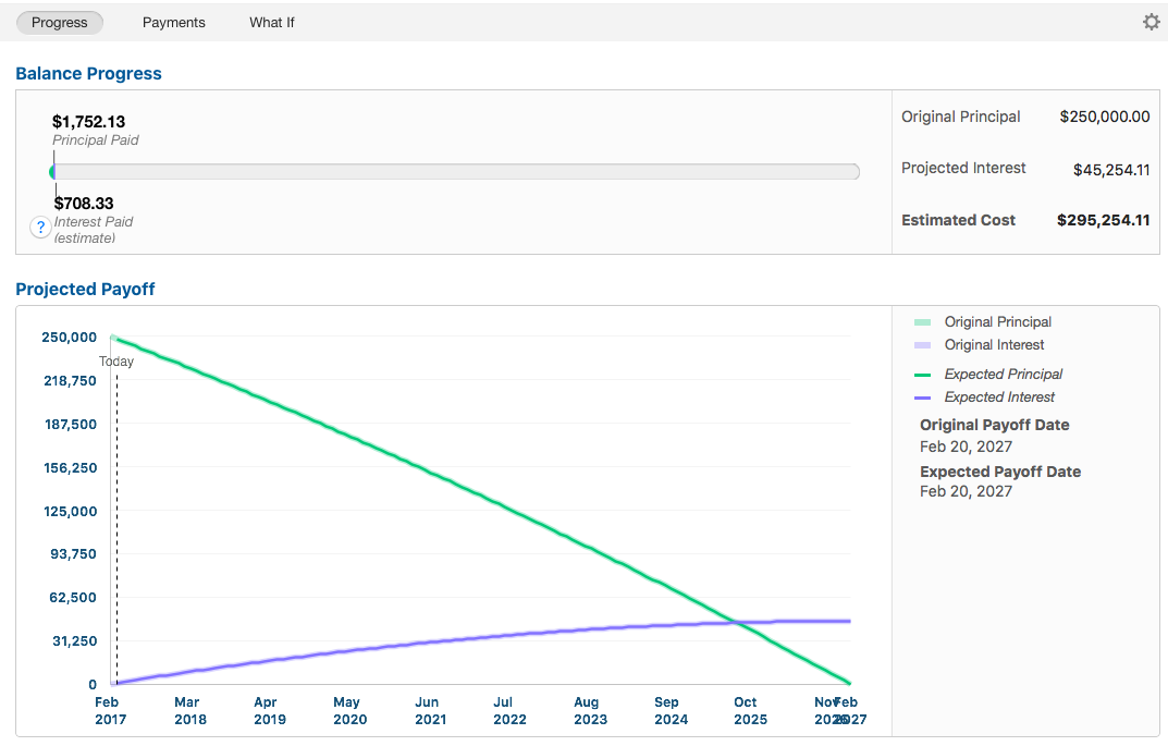 The progress view shows the loan and how long it will take to pay it off over the life of the loan. In the beginning, it will look a little rough, but if you start to make additional payments, it will quickly start to look like you are making progress.