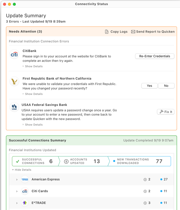 When your update is complete, you will see a Connectivity Status window. That window will let you know what accounts connected successfully. You may also see a Needs Attention panel that will inform you of any connectivity issues and suggest a resolution, such as Re-Enter Credentials. You can recall the Connectivity Status window by going to the menu bar at the top of the screen and selecting Window > Connectivity Status.