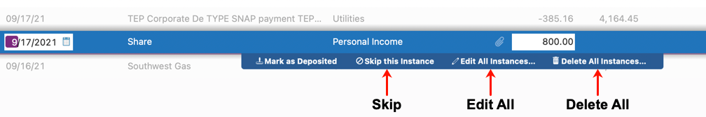 | Delete Transaction | Gives you the option to Delete this series of transactions, Skip this instance, or Edit this and all future transactions. |