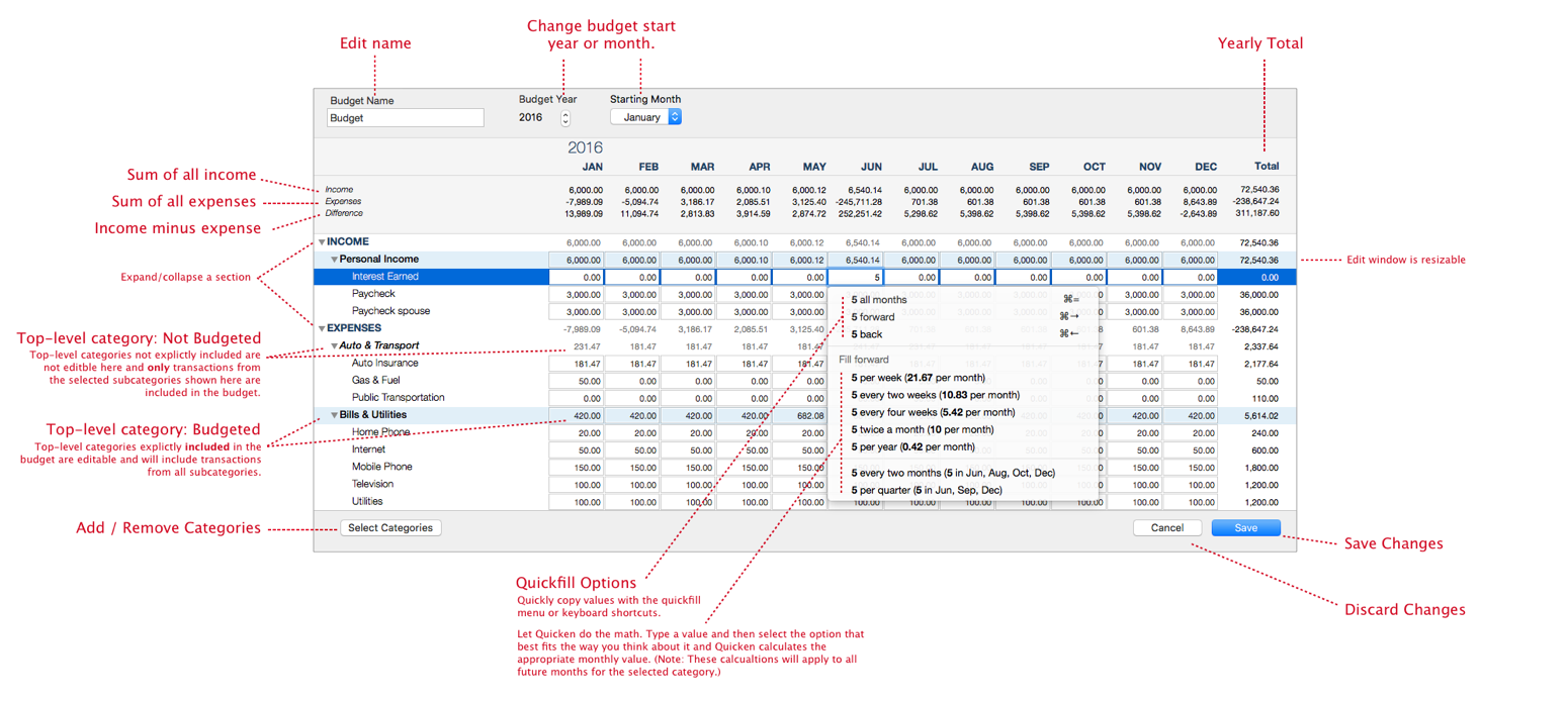 - Rollup values (top-level category sums, income, and expense sums) are recalculated as you make changes so you can see the impact of every edit.