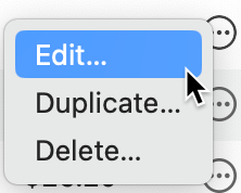 Review the entries on the mileage list. For the mileage entry you want to edit, click the three-dot menu and select Edit.