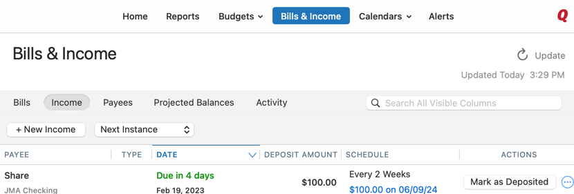 The Income view is designed to track incoming deposits from paychecks and other income. For income items to appear, you must create a reminder for your income.
