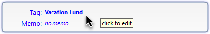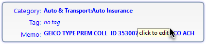Click inside the Details panel to enter or change any details (Category, Tag, Memo). The split transaction option is available for Category.