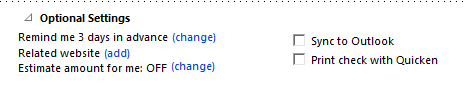 Due next on: The next due date for that bill Quicken will base its future reminders on that date. use the Change link to make further adjustments, such as changing How often the bill comes due (such as quarterly or annually) and setting an End date for reminders if the bill is temporary. See Data Options table below.