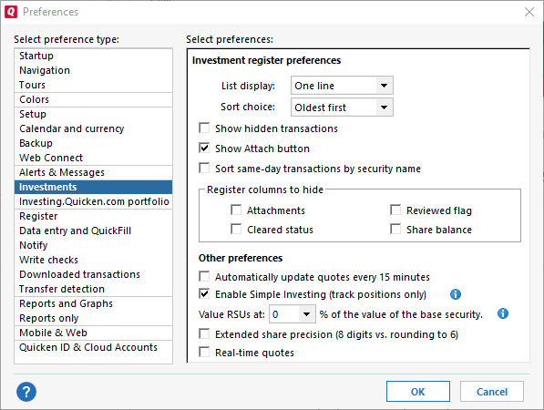 Preference Description List display Use the drop-down list to choose whether to display your investment transaction lists in one or two lines. Sort choice Use the Sort choice drop-down list to display your investment transactions by date in ascending (Oldest first) or descending (Newest first) order. Show hidden transactions Select this option to obtain access to balance adjustments and previously resolved placeholder entries for your accounts. This gives you greater control of your balance should you need to remove these transactions to correct historical errors. In addition, you can see how your account calculates the balances for your securities and cash. Show Attach button The Attach button appears next to the Enter, Edit, and Delete buttons at the bottom right of the current transaction. It provides a way for you to attach an electronic image to a transaction. Sort same-day transactions by security name Turn on to sort same-day transactions alphabetically (A-Z) by security name. Register columns to hide You can hide any of the following columns in your investment register to simplify the view: Attachments, Cleared Status, Reviewed flag, and Share balance. Automatically Update Quotes every 15 minutes Quicken will automatically retrieve quotes for your securities every 15 minutes. This feature is available in Quicken Premier, or Home & Business. Enable Simple Investing (positions -only) With Simple Investing, Quicken keeps track of the positions (number of shares for each security) over time and your cash balances. Quicken’s tracking is based on information provided by your broker. Your portfolio value, net worth, and investment returns over time will be available, but Quicken will not be able to calculate capital gains and losses or investment income. Quicken will display an account summary rather than an investment transaction register when the account is selected.