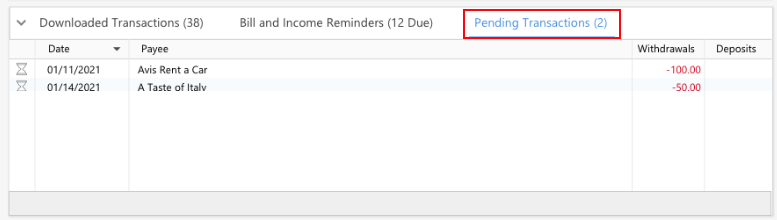Pending transactions are limited to the Register and Account Bar. Pending transactions are not included in Quicken features such as reconciliation, budgets, and reporting.