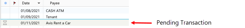 Pending transactions appear in your register. They are separated from other transactions by a solid green line and displayed with a different shade of color than standard transactions so you can easily identify them. They also display an hourglass icon in the Status column.