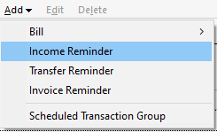 - On the Bills and Income Reminders screen, select Add menu → Income Reminder.