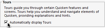 Tours are Quicken's way of walking you through the steps of setting up and using Quicken. They guide you through features and explain screens and buttons. While this is a useful tool for beginners, it only displays the first time you use a feature. If you want to turn Tours on, use the Tours preference.