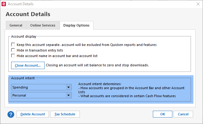 You cannot change an account type (for example changing a Savings account to a Credit Card account). You can, however, change the Account Intent (such as from personal to business). Many options are only available for higher tiers of Quicken such as Quicken Business & Personal.