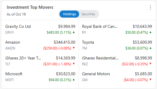 If you are using Quicken to track investments, the Investment Top Movers card will show the investments with the highest percentage change, either up or down. It will show the information for the day of your most recent update, listing the date on the card. During trading hours, the information will reflect a fifteen-minute reporting delay. You can also choose to view top movers in all of your holdings or only in securities.