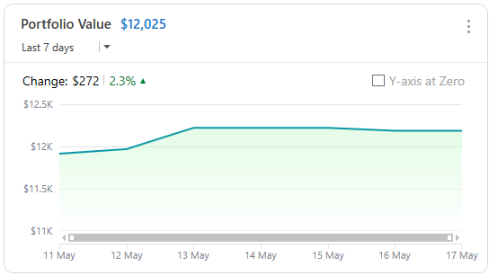 The Portfolio Value card shows the total worth of your investment holdings and tracks the change in value. You can choose from several different time periods. Turning off Y-axis at Zero will focus on the value changes rather than the total portfolio value.