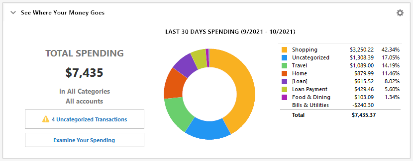 The Top Spending Categories card shows what categories you are spending your money in. The default view is for the Last 30 days, but you can choose other time periods as well. You can hover your pointer over any category to see more information about your spending in that category. You can click a category to see the transactions associated with that category.