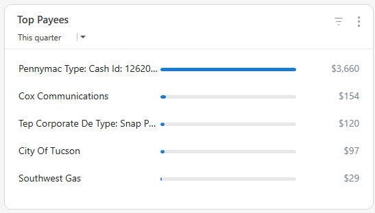 The Top Payees card shows you the payees that have received the most money. You can adjust the date range to get a better idea of your spending over time. You can also hover your pointer over a payee to see how much money you have sent them, and what percentage of your total spending was given to that payee. Click a payee to see a spending report for that payee.
