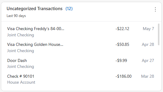 The Uncategorized card is an excellent resource that you can use to assign categories to your transactions. You can click any transaction to review it on a list of your uncategorized transactions.