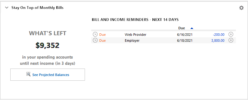The Recent Transactions card shows you what transactions you've made in the last three days. If you have many transactions, you can scroll through them on the card. You can also hover your pointer over a transaction to get more details about the Account and Category. You can click a transaction to see that transaction in your register.