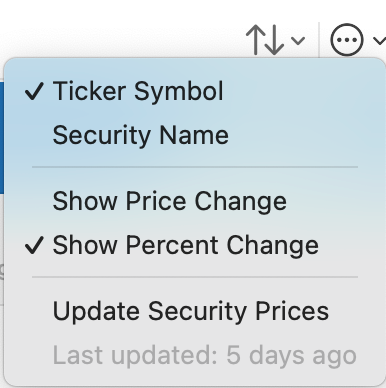 You can change the appearance of the items on your Watchlist by selecting the three-dot menu. You can view them by Security Name or Symbol. You can also choose to Show Price Change or Show Percent Change.