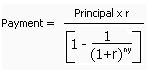Quicken's amortization features use the formulas shown here to calculate the payments, principal, and interest for your loan.