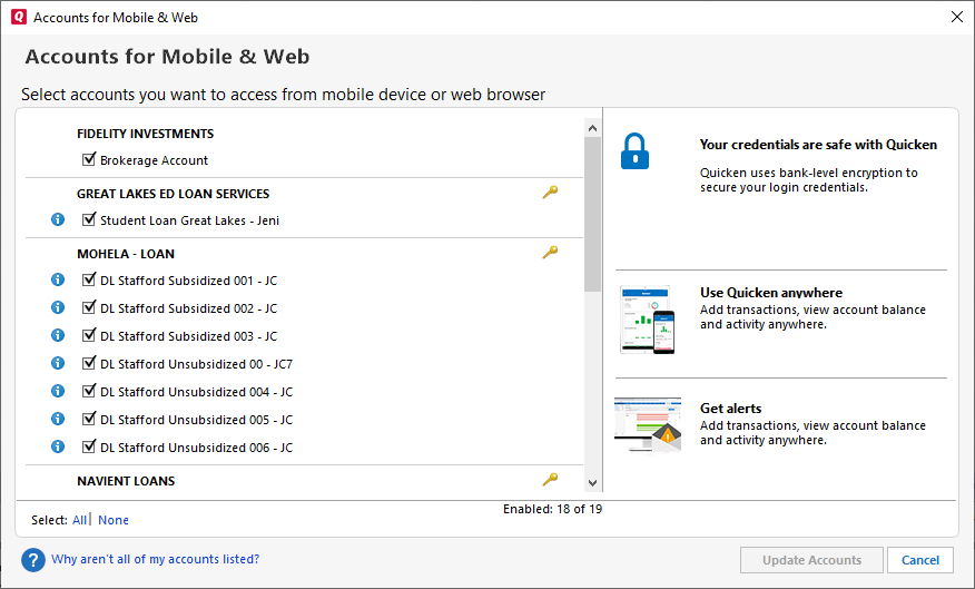Why can't I use all of my accounts with Quicken for mobile?