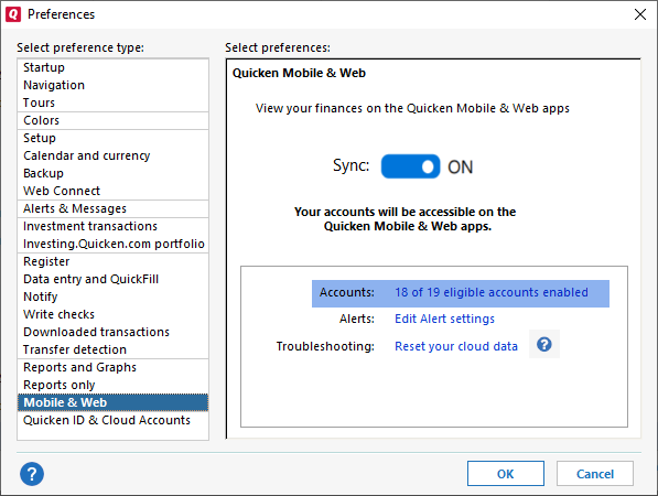 Only the following Quicken accounts can be synced with your mobile device and used for alerts